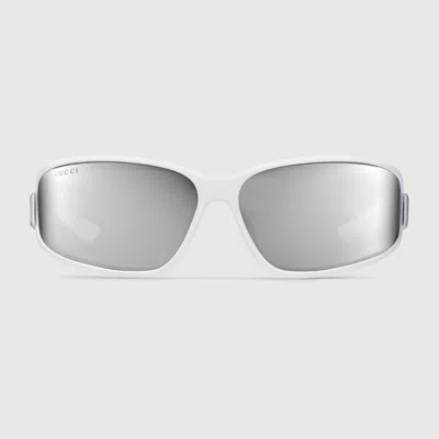 The eyewear collection blends a sleek silhouette and signature motifs in a contemporary design. These rectangular sunglasses feature an engraved Gucci logo on metal plaque across the white injection temples. Matte white injection frames, Matte white injection temples with engraved Gucci logo on metal plaque, Solid grey mirrored lens, 100% UVA/UVB protection, GG2011S, Temple length: 11.5cm, Lens height: 4.1cm, Nose bridge length: 1.4cm, Frame height 4.5cm, Frame width 14.4cm, Hinge to hinge 13.5cm, Made in Italy, The soft black pouch is complete with an elastic drawstring, the Gucci logo and Interlocking G details.