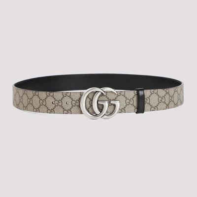 Within the Gucci Aria Collection, the revival of archival emblems speaks to the idea of transcending seasons. This thin reversible belt is presented in beige and ebony GG Supreme canvas on one side and black leather on the other, adding a versatile note to a classic accessory. The style is completed by the signature Double G buckle. , Beige and ebony GG Supreme canvas, on one side and black leather on the other, Palladium-toned hardware, Double G buckle, Can be worn as a hip or waist belt. Sizing will differ based on where the belt is worn, please refer to the size guide to find your size. 3cm width, Made in Italy