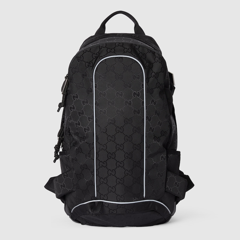 * Black GG nylon jacquard * Black trim * Reflective white, water-resistant lining * Padded mesh back * Padded GG nylon jacquard shoulder straps * Drawstring detail * Web detail * Chest and waist straps with buckle * Inside: 1 open compartment * Outside: 2 side ski holders, 2 front ski rackets holders, 1 zip pocket and 1 gloves holder * Handle drop: 1.9' * Zip closure * 10.2'W x 17.3'H x 7.8'D * Weight: 2.8lbs, approximately * Made in Italy * Fits a laptop, iPad, A4 notebook, iPhone Plus other small items
