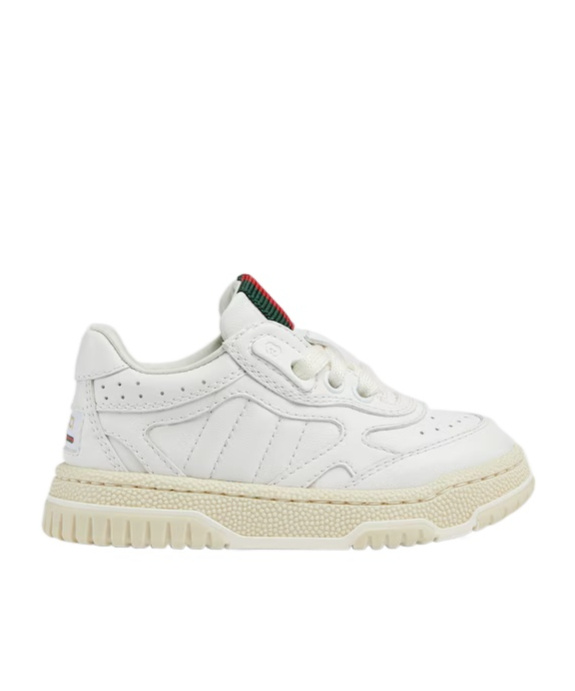 The Re-Web sneakers were the first footwear silhouette introduced by Sabato De Sarno for the House of Gucci, hereby rendered to fit your little ones. Taking a renewed, subtle approach to the brand's iconic webbing, four tonal lines of stitching detail the side, while the green and red hues feature on the tongue. Style them with the Gucci Kids jeans for a cool-kid statement.