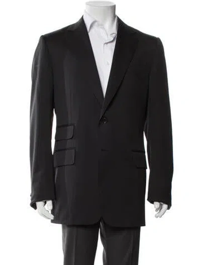 Men's solid black Gucci blazer with notched lapels, logo jacquard lining, flap pockets, single vent and two button closure at front. | Gucci Solid Blazer in Black, Men's XL