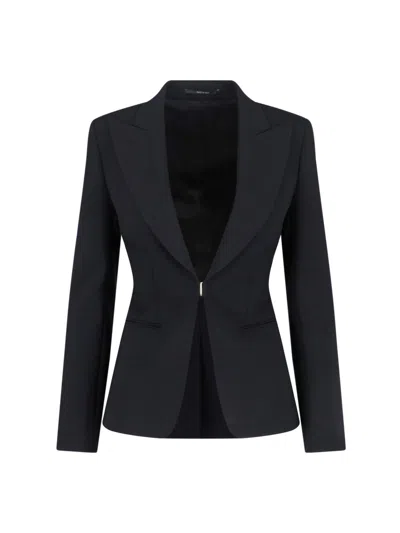 Gucci black stretch wool blazer with peak lapels, grosgrain hook closure, GG lining, two front welt pockets, central back split, and straight hem.