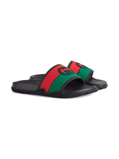Black/multicolour logo-debossed slides from GUCCI KIDS featuring debossed logo to the front, open toe, open back, slip-on style, moulded footbed and flat rubber sole.