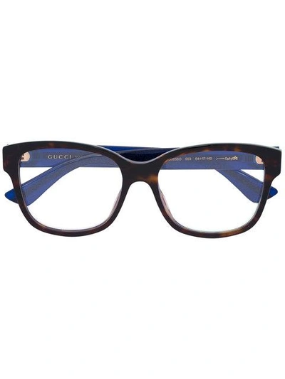 Braune Brille mit Bügeln mit Webstreifen aus Acetat von Gucci Eyewear mit folgenden Eigenschaften: quadratisches Gestell, Logo-Abziehbild auf dem Glas, Elemente in Schildpattoptik, charakteristische blau-rote Webstreifen, goldfarbenes Logo an der Seite und gerade Bügel mit gebogenen Enden. Dieser Artikel wird mit einer Schutzhülle geliefert.