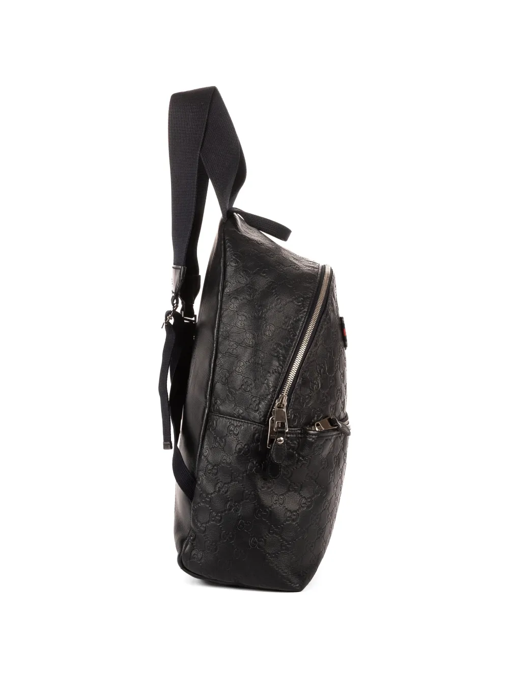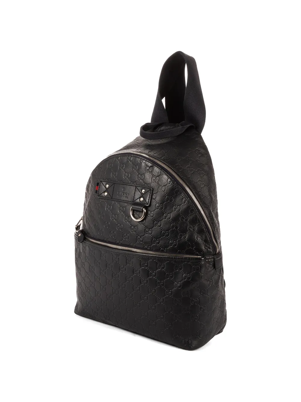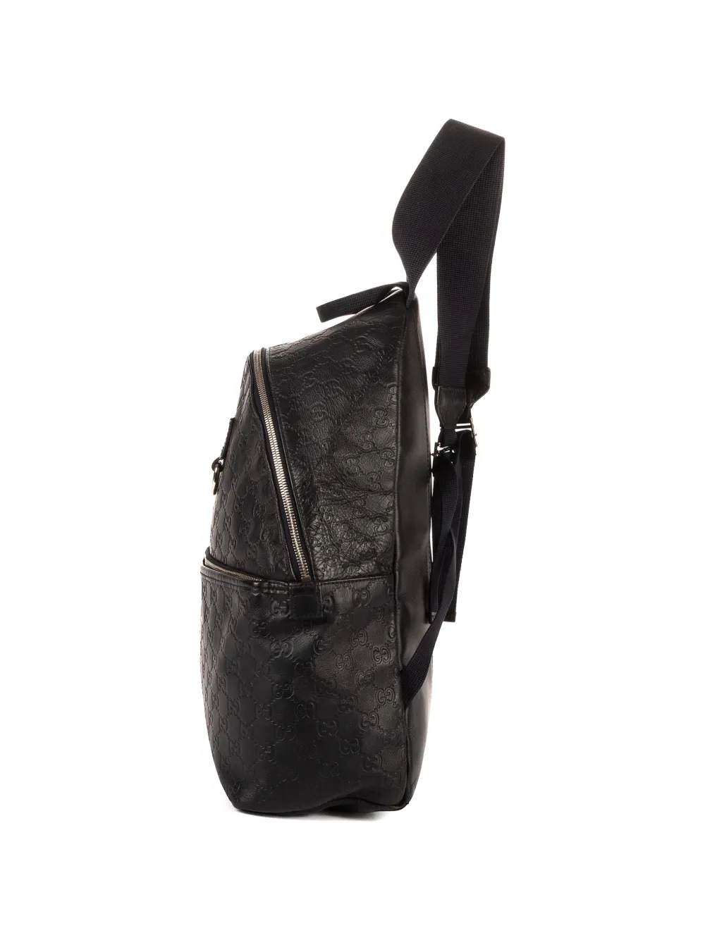 black Guccissima leather debossed monogram pattern two adjustable shoulder straps single top handle front zip-fastening pocket silver-tone hardware top zip fastening