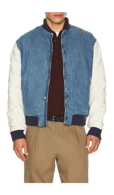 Guess Jeans Denim Letterman Jacket in Blue. - size XL/1X (also in L, M, S, XS) Guess Jeans Denim Letterman Jacket in Blue. - size XL/1X (also in L, M, S, XS) Self: 99% cotton 1% elastane Sleeve Fabric: 100% cotton Fill & Lining: 100% polyester. Machine wash. Front button closure. Side seam pockets. Ribbed trim. Logo detail at back. Midweight denim fabric. GJEA-MO7. M5BN59D5M54.