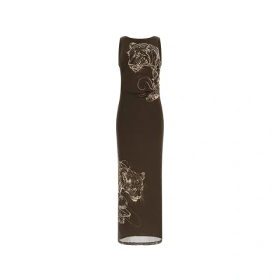 Aspect drapéCoupe ajustéeCol rondSans manchesDécolleté en U dans le dosFente sur la jambe gaucheDoublureMotif de tigresLogo marque dans le dosLongueur fente: 60cmLongueur dos: 118cm Aspect: - Coupe: - Longueur: - Fermeture: - Emmanchure: - Manches: - Col: -