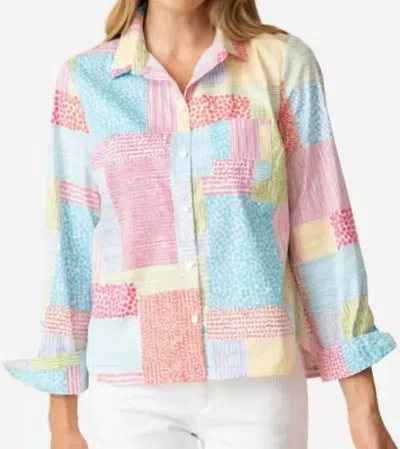 A timeless blouse that will never go out of style.Multi color patchwork patterns ramp up this classic button up shirt. It features a pointed collar, a front pouch pocket and a round high-low hemline. The perfect shirt to bright your wardrobe. Machine wash cold gentle, tumble dry lowSmall measures 36" bust, 23-25" lengthMedium measures 38" bust, 23-25" lengthLarge measures 40" bust, 23-25" lengthXL measures 42" bust, 24-26" length
