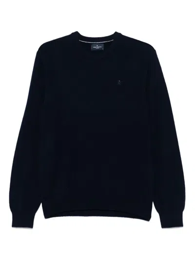 midnight blue ribbed trim embroidered logo at the chest crew neck