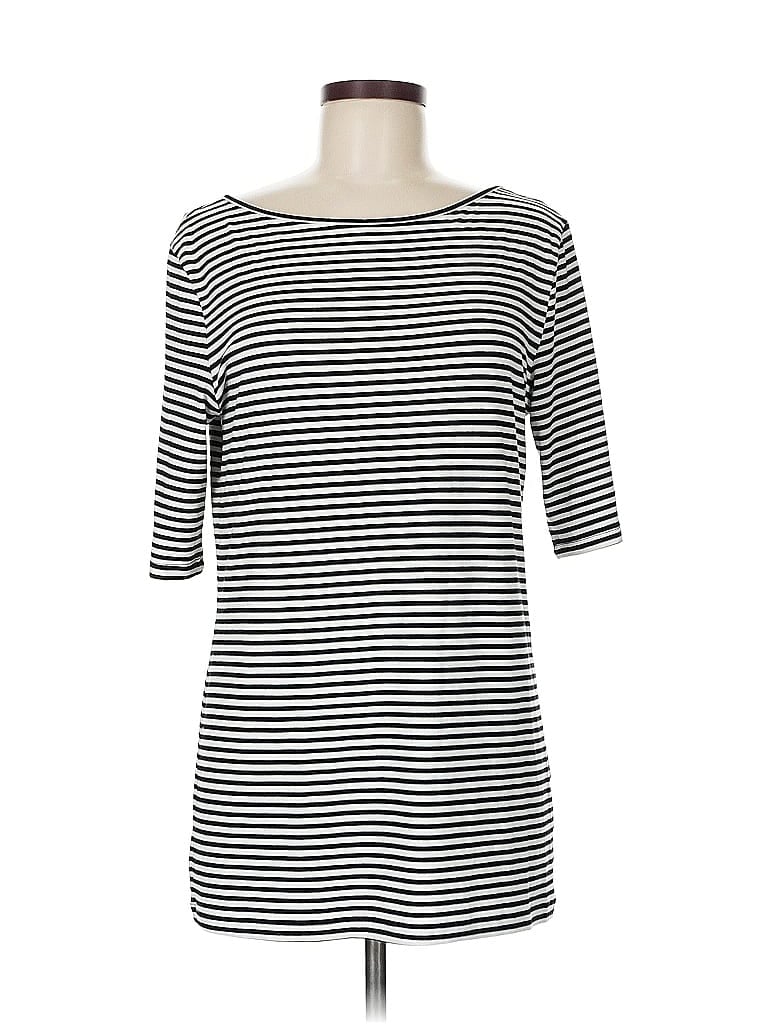 Halogen Casual Dress, Size: Medium. Item Details: Black, Stripes Pattern, Boatneck, Short Length, 3/4 Sleeve, Women's Dresses, Rayon/Spandex