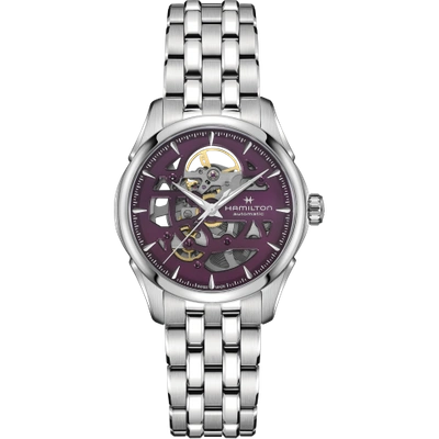 Brand New Authentic Hamilton Jazzmaster Skeleton Auto Lady Purple Dial Steel Women's Fashion Watch Model H32265101. Polished Stainless Steel case with Brushed and Polished Stainless Steel Bracelet watch band. Brushed and Polished Stainless Steel Folding clasp. Fixed bezel. Dial description - Luminous Silver Tone Hands and Stick Hour Markers with Minute Markers Around the Outer Rim on a Purple Open Dial. Swiss Automatic movement. Powered by Hamilton Calibre H-10-S engine with 80 hours power reserve. Watch functions - Hour, Minute, Second, Power Reserve. Push-Pull crown. Scratch Resistant Sapphire crystal. Round case shape. Case size - 36mm. Case thickness - 10.55mm. Transparent case back. 50 Meters - 165 Feet water resistant. 2 year WatchMaxx warranty. Also known as model - 32265101.