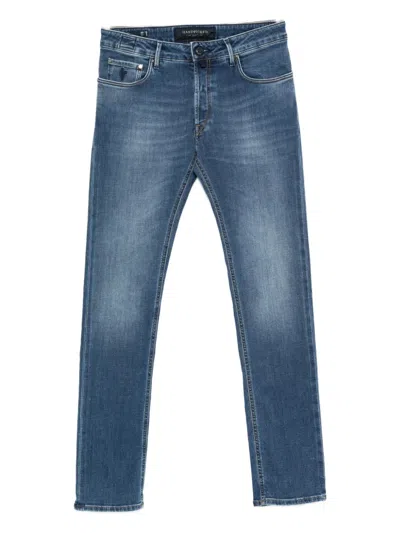 light blue five-pocket styling button fly belt loops straight leg contrast stitching