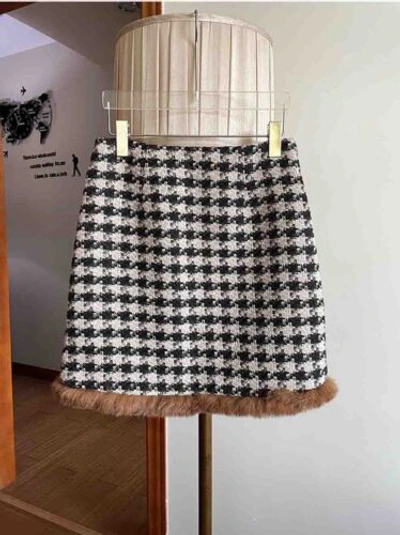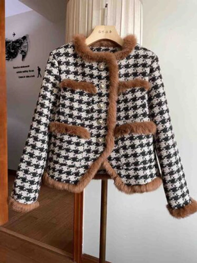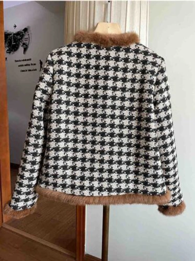 Pre-owned Custom Made To Order Houndstooth Fur Trim Short Overcoat Coat Plus X-10x L844 In Black/white