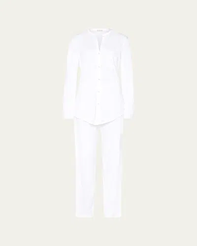 Choose tender rose, white Hanro knit jersey pajama set Round neckline; button front Long sleeves Chest patch pocket Shirttail hem Matching pants Elasticized waistband Full length Straight legs Mercerized cotton Made in Portugal