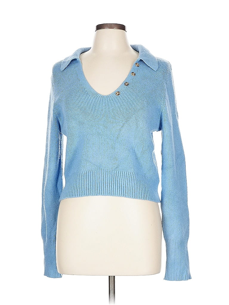 Happily Grey Pullover Sweater, Size: Large. Item Details: Blue, Collared Neckline, Long Sleeve, Studded, Women's Tops, Rayon/Polyester/Nylon