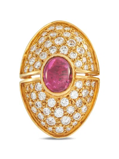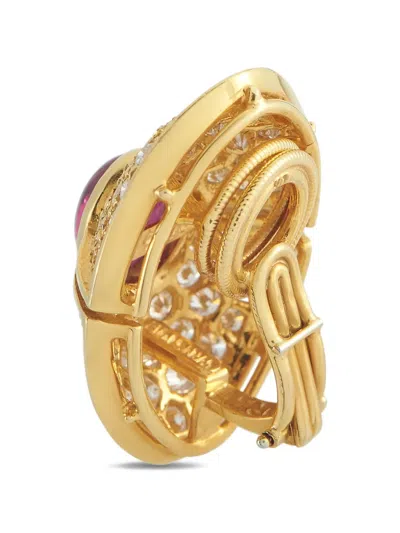 18K yellow gold polished finish bezel-set oval-cut ruby totalling 4.0 carats pavé-set round-cut diamonds totalling 3.70 carats clip-on design Your purchase will arrive with a gift box. Normal everyday use and external agents may reduce the lustre of gemstones and gold surfaces. To maintain, use specific, non-abrasive products specially meant for cleaning jewellery. Condition: EXCELLENT. This previously owned item is in near-perfect condition with no signs of damage or use.