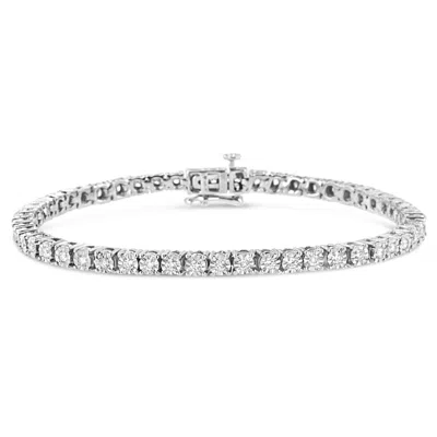 Elegant and timeless, this gorgeous pure 92.5% sterling silver tennis bracelet features 1, 2, or 3 carat total weight of round lab-created diamonds. The illusion-setting of this bracelet features unique miracle plates that center each diamond in a mirror-finish, high-polish frame. Modern yet antique-inspired faceted bezel settings give the illusion of much larger stones, magnifying the sparkle. This 7.25 bracelet has a box-with-tongue and safety clasp fastener and is crafted of real 925 sterling silver that has been electro-coated with genuine rhodium (a platinum-family metal), ensuring it will keep a tarnish-free shine for years to come. This sweet bracelet makes a perfect Valentines Day gift, or as a way to remember someone close to your heart. Its a classic and feminine piece shell want to show off every day. Whether worn for daytime glamour or evening sparkle, this bracelet is gorgeously versatile. Give her a gift that will perfectly complement almost any ensemble.