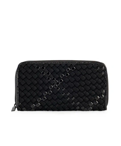 Upgrade your accessories with this chic wallet. Its standout appearance highlights your personal style, while its compartments offer efficient storage for your financial essentials.Black coated with silver & white stripe. Full size zip around wallet featuring 2 bill slots, 1 zip change slot and 10 card slots. Measurements 8 x 4.5 inches. Neoprene.