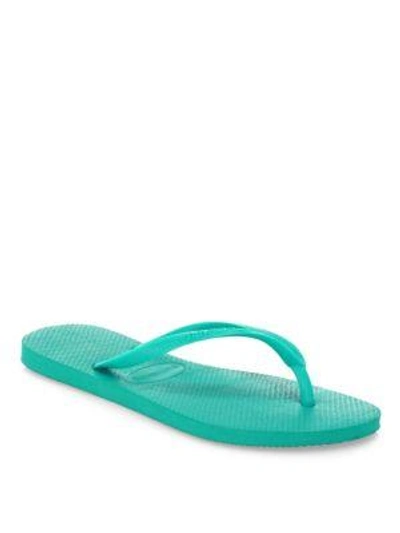 Slim flip-flops from Havianas are offered in eight colors, ranging from four neutral shades and four bold colors that will work into every women's summer wardrobe. Rubber Footbed height: 1/2" Made in Brazil MINT GREEN