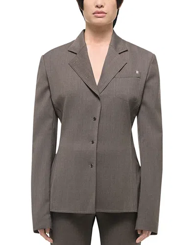 A dynamic mix of materials, this Helmut Lang shirt pairs its virgin wool front with a structured ponte knit back. Strong shoulders, notched lapels and tailored seams reflect traditional suiting. Button closure Notched lapel collar Chest patch pocket Structured shoulders Contrast stitched seams Wool suiting front Ponte knit back Self: 100% virgin wool Dry clean only Made in China Size & Fit Fits true to size Please note, below measurements reflect Helmut Lang's size chart, not the actual garment. Size US 0: 31.5in bust, 25in waist, 35in hips Size US 2: 32.5in bust, 26in waist, 36in hips Size US 4: 33.5in bust, 27in waist, 37in hips Size US 6: 34.5in bust, 28in waist, 38in hips Size US 8: 35.5in bust, 29in waist, 39in hips Size US 10: 36.5in bust, 30in waist, 40in hips Size US 12: 38in bust, 31.5in waist, 41.5in hips Helmut Lang Women's Combo Suit Shirt in Light Brown Melange Wool