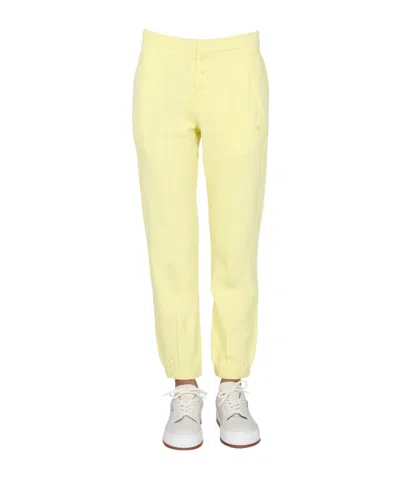 elastic waist with inner coulisse front button closure two side pockets back pocket front embroidered logo brushed inner 100% cotton model is 185 cm tall and wears size s