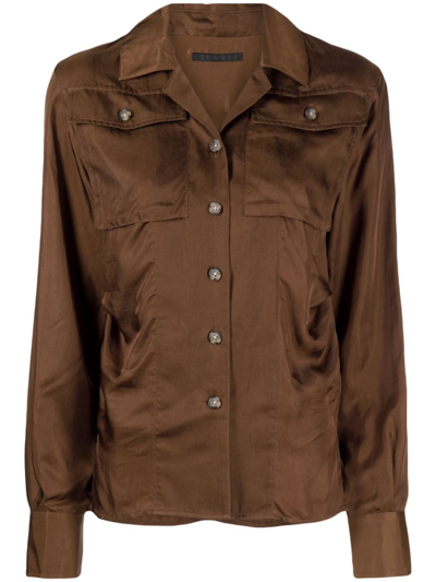 long-sleeve satin-finish shirt from HELMUT LANG featuring tobacco brown, satin finish, crinkled finish, notched collar, front button fastening, long sleeves, buttoned cuffs, two chest patch pockets and straight hem.