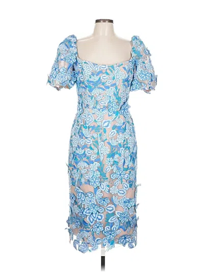 HELSI Cocktail Dress, Size: Medium. Item Details: Blue, Paisley Pattern, Square Neckline, Midi/Calf Length, Short Sleeve, Women's Dresses, 100% Polyester