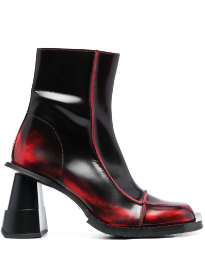 Elle Driver Heel 100mm leather boots from HENRIK VIBSKOV featuring crimson, jet black, calf leather, smooth grain, distressed effect, contrast stitching, exposed-seam detailing, square toe, side zip fastening and 100mm high sculpted heel.