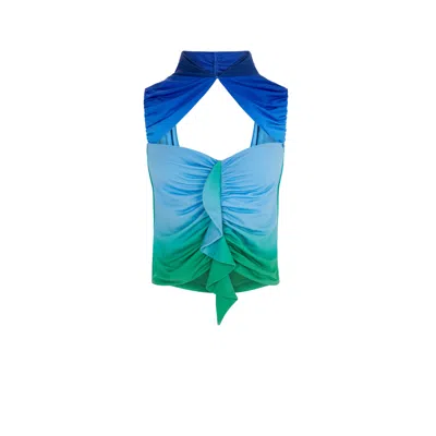 This two-piece set features a sculptural top with a twisted halter neckline and ruched detailing in ocean blue and green hues. The matching skirt is high-waisted with a cascading ruffle down the front, blending blue into a fresh green ombré. The look is bold, artistic, and fluid — evoking a sense of movement and underwater fantasy. 90% Polyester 10% Lycra, Do Dry Cleaning Made in Turkey