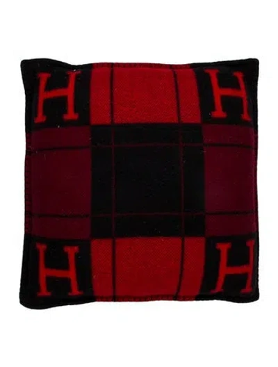 Red, black and multicolor wool Hermès Avalon throw pillow with patterned 'H' motif throughout, whipstitch edges, concealed zip closure at reverse and brand label at interior. Made in Great Britain. | Hermès Avalon Throw Pillow in Red