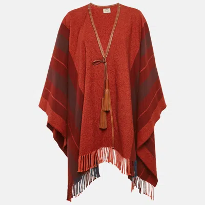 Pre-owned Hermès Brown Striped Wool And Leather Trim Rocabar Poncho One Size