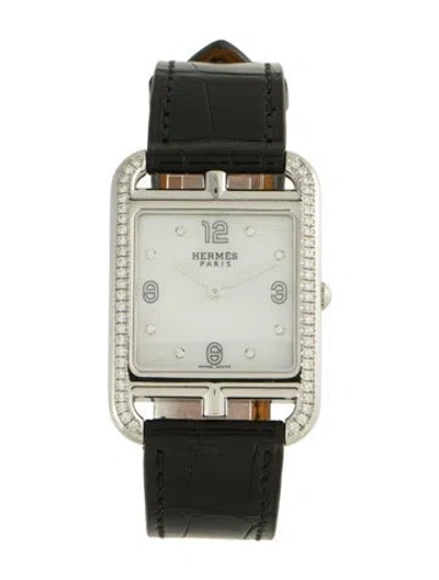 Cape Cod Collection29mm x 41mm Case Dimensions Stainless Steel Quartz Movement Diamond Bezel Mother of Pearl Dial Black Alligator Strap Tang Buckle Includes Collateral Unfortunately, due to restrictions, this item may not be eligible for shipping in all areas. | Hermès Cape Cod Watch