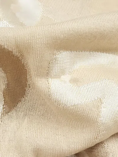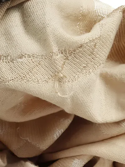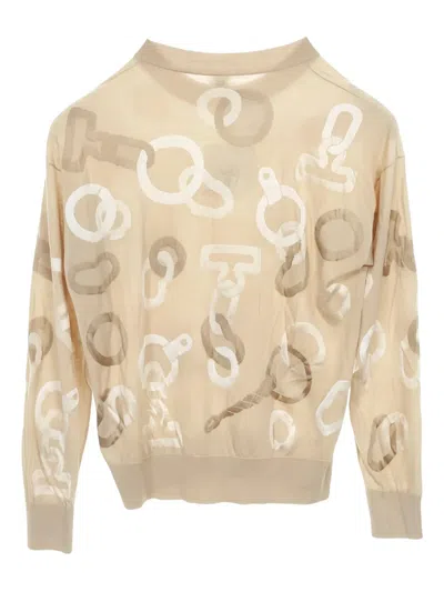 beige fine knit chain pattern round neck long sleeves Condition: EXCELLENT. This previously owned item is in near-perfect condition with no signs of damage or use.
