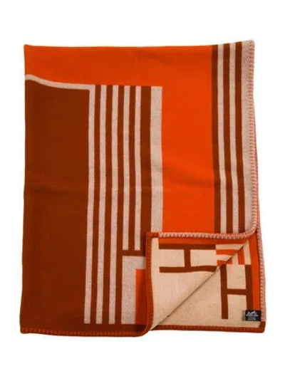 Potiron, Ecru and multicolor Merino wool and cashmere blend Hermès Ithaque throw blanket with brand signature H pattern at corners, striped H motif throughout, whipstitch edges and brand label at reverse. Made in Italy. Includes box. | Hermès Ithaque Throw Blanket in Orange