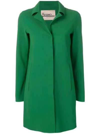 Mixing revolutionary production techniques and Italian craftsmanship tradition, Herno designs unique pieces for the harshest winters. This green classic single-breasted coat features a classic collar, long sleeves, a front button fastening, side pockets and a mid-length.