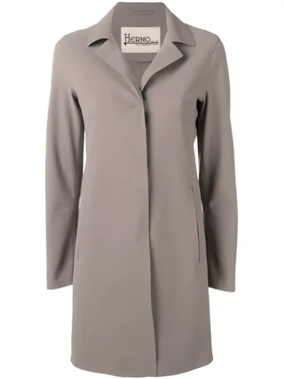 Mixing revolutionary production techniques and Italian craftsmanship tradition, Herno designs unique pieces for the harshest winters. This stone grey classic single-breasted coat features a classic collar, long sleeves, a front button fastening, a straight fit, side pockets and a mid-length.