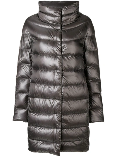 Down jacket High collar Grey Quilted nylon Concealed front closure Long sleeves Back metal logo Composition: 100% Polyamide