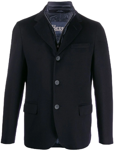 Herno enables you to look sharp and keep warm this winter. Crafted from navy cashmere, this blazer presents a down layer underneath for extra heat protection. The best of both worlds! Featuring a layered design, a high standing collar, notched lapels, a front button fastening, long sleeves, a chest pocket and front flap pockets.