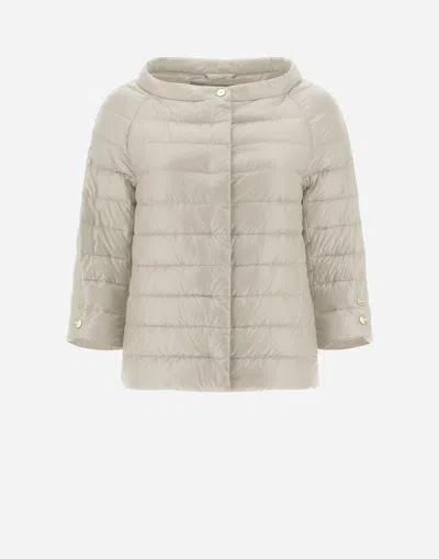I came to be at the water's edge, snow-topped mountains rising up behind me. My name, almost majestic, comes from the stunning villas around Lake Maggiore, just like my sisters' names. I am Elsa, casual yet sophisticated. An egg shape in the unmistakable Herno style with petal sleeves, made from 80 g Ultralight nylon. The injected padding in ultra-fine goose down and the silky-effect nylon make this garment extremely lightweight and delicate to the touch. Regular fit Cowl neck Concealed press-stud fastening Petal sleeves with press-stud fastening Welt pockets Performance: WR treatment