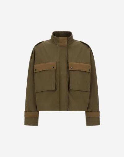 Jacket made from raw cotton gabardine and finished with a special dye that enhances the texture. The material undergoes a waterproofing process that makes it even more high-performing. Offering a chic, feminine take on the classic field jacket, this piece is complete with details in naturally stretchy, compact polyester taslan with water-repellent treatment. This fabric, created by Herno - Officina Tessile, symbolises our heritage and the innovative research it has honed since 1948. Regular fit High collar Epaulettes Pockets with flap and press studs Cuffs with strap Metal Herno logo on the back Zip and press-stud fastening Lined Made in Italy Performance: Water-repellent treatment