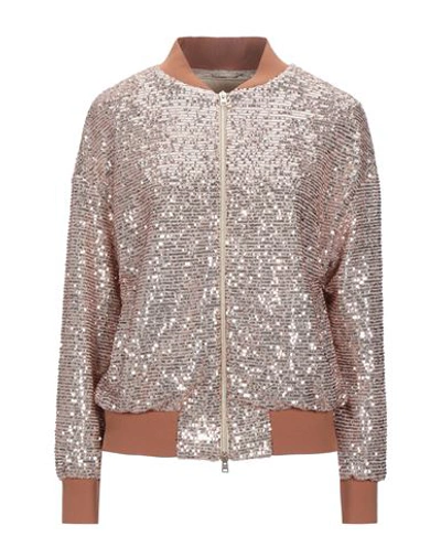plain weave, sequins, solid color, crew neck, single-breasted , long sleeves, fully lined, zipper closure, multipockets, bomber jacket , Color: Light brown , Size: 8