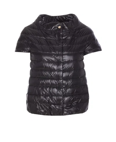 I came to be at the water's edge, snow-topped mountains rising up behind me. My name, almost majestic, comes from the stunning villas around Lake Maggiore, just like my sisters' names. I am Emilia, transcending trends and seasons. A short-sleeved cape in the unmistakable Herno style, made from 200 g Ultralight nylon. The injected padding in ultra-fine goose down and the silky-effect nylon make the garment extremely lightweight and delicate to the touch. Regular fit Cowl neck Concealed press-stud fastening Short sleeves Welt pockets Performance: WR Treatment Herno Icons 100% PA - MAIN FABRIC: 100% POLYAMIDE / NYLON LINING: 100% POLYAMIDE / NYLON TRIMMING: 55% COTTON 45% POLYESTER PADDING (FEATHER): 90% DOWN 10% FEATHER