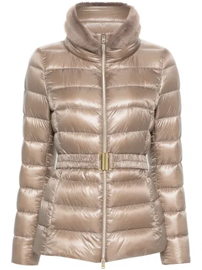 Beige 'Claudia' down jacket by Herno made from the iconic ultralight nylon that combines good water resistance with a particularly luxurious silk-like feel. The model is characterised by a slim design with a high neck and an elastic waistband that enhances the silhouette. The proportions of the garment are designed to follow movements and ensure an impeccable fit, while the fine down padding is soft, light and retains heat. - Herno - Pimino 'Claudia' - Beige - Slim design - High neck - Double slider zip closure - Elastic belt with metal buckle - Pockets with invisible zip - Feather filled Cut: 42, 44, 46, 48