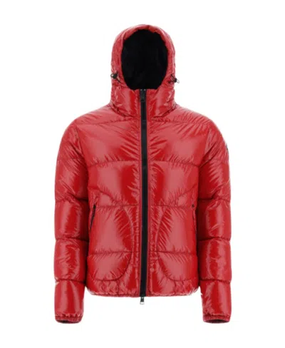 logo-patch padded puffer jacket from HERNO featuring red, feather down, high-shine finish, padded design, classic hood, logo patch at the sleeve, front zip fastening, two side zip-fastening pockets, long sleeves and straight hem.