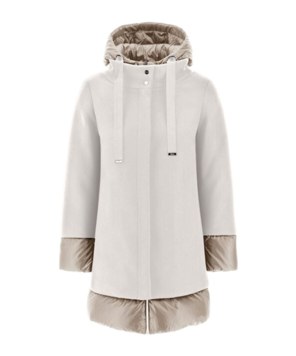 Drawcord hood, covered with two-way zipper and snap open, closed zipper pockets, feather padding.