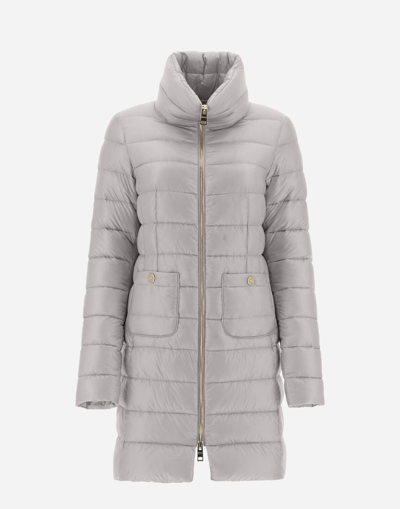 I came to be at the water's edge, snow-topped mountains rising up behind me. My name, almost majestic, comes from the stunning villas around Lake Maggiore, just like my sisters' names. I am Maria, warm, comfortable and oh-so-practical. A long coat embellished with patch pockets in the unmistakable Herno style, made from 200 g Ultralight nylon. The injected padding in ultra-fine goose down and the silky-effect nylon make the garment extremely lightweight and delicate to the touch. Slim fit Gold-colored two-way maxi-zip fastening Patch pockets with golden press-studs Performance: WR Treatment