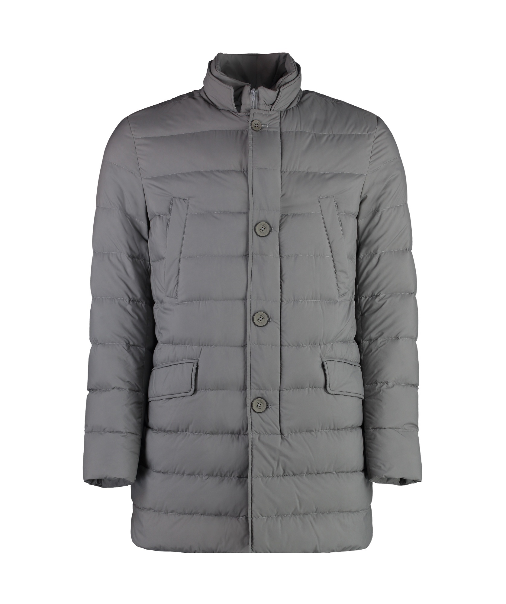 This down jacket combines sustainability with warmth, crafted from recycled materials and filled with quality goose down and feather. With thoughtful features for practicality, it balances style and function. Ideal for those who appreciate eco-friendly fashion without compromising on comfort. Recycled materials construction 90% goose down and 10% goose feather padding for superior warmth Two hand-warmer pockets Two buttoned front flap pockets Durable polyamide and polyester outer fabric | Herno Men's Techno-Nylon Down Jacket in Grey | Size 50 | PI007ULE12456Z Color 9406