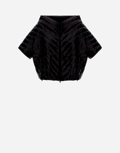 A-line jacket in a comfortable and breathable nylon jersey, featuring a regular metallic print for a refined and glamorous finish. With a V-shaped neckline that slips over the shoulders and short sleeves, the garment is designed to complete more original looks. Boxy fit V-neck Short sleeves Two-way zip fastening Zipped pockets Down-padded Made in Italy