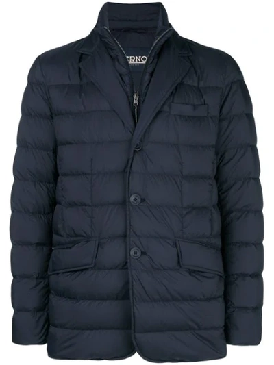Founded in 1948, Herno’s revolutionary production processes operate alongside traditional methods and the result is an inimitable mix of materials with a unique contemporary feel. Details, personality and functionality beyond just aesthetics. This dark blue padded single breasted jacket is crafted with a warm feather down and features a high standing collar, long sleeves, side flap pockets, a zip and button fastening and a padded design.
