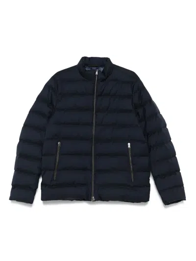 navy blue padded design zip fastening high neck welt pockets long sleeves